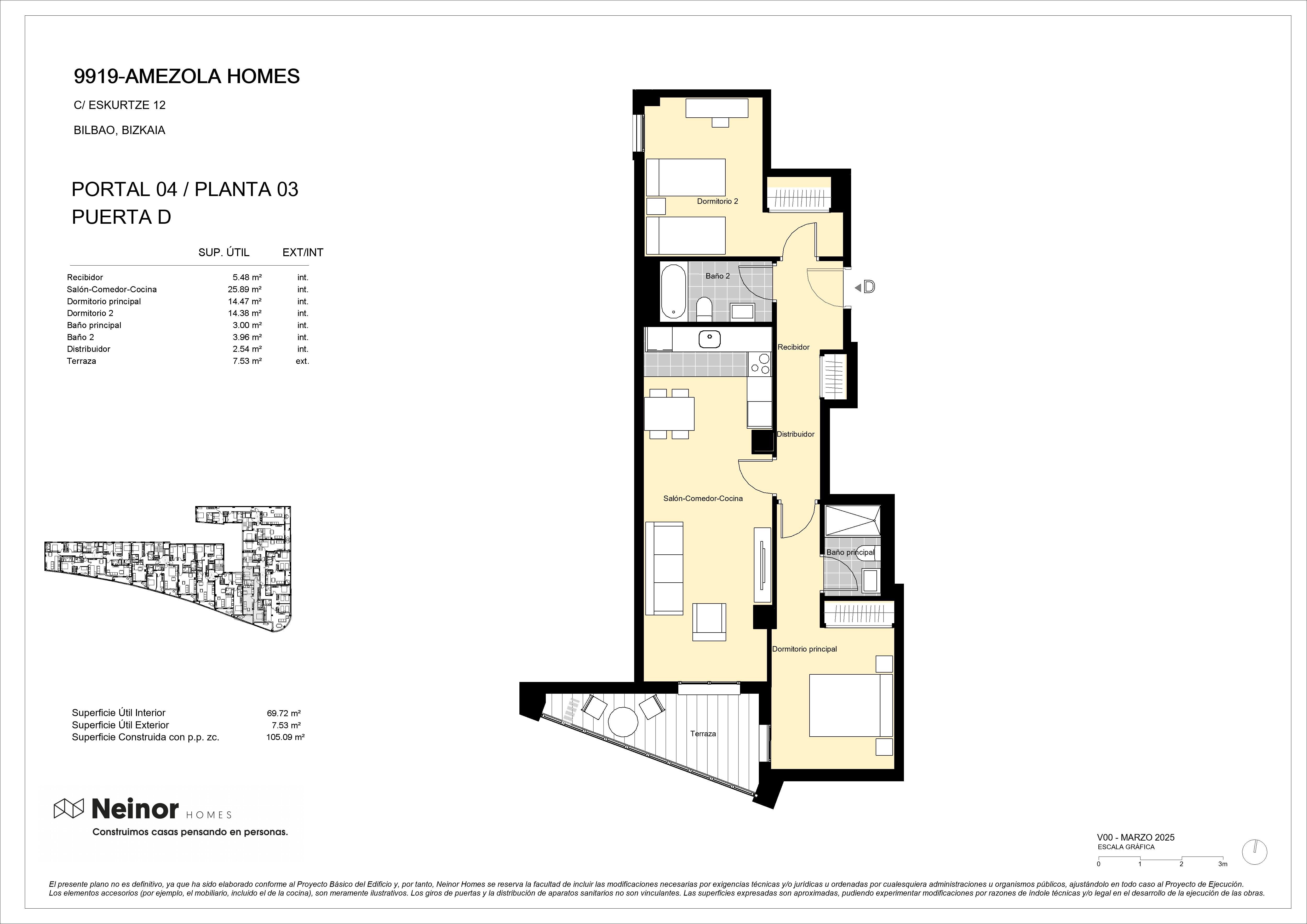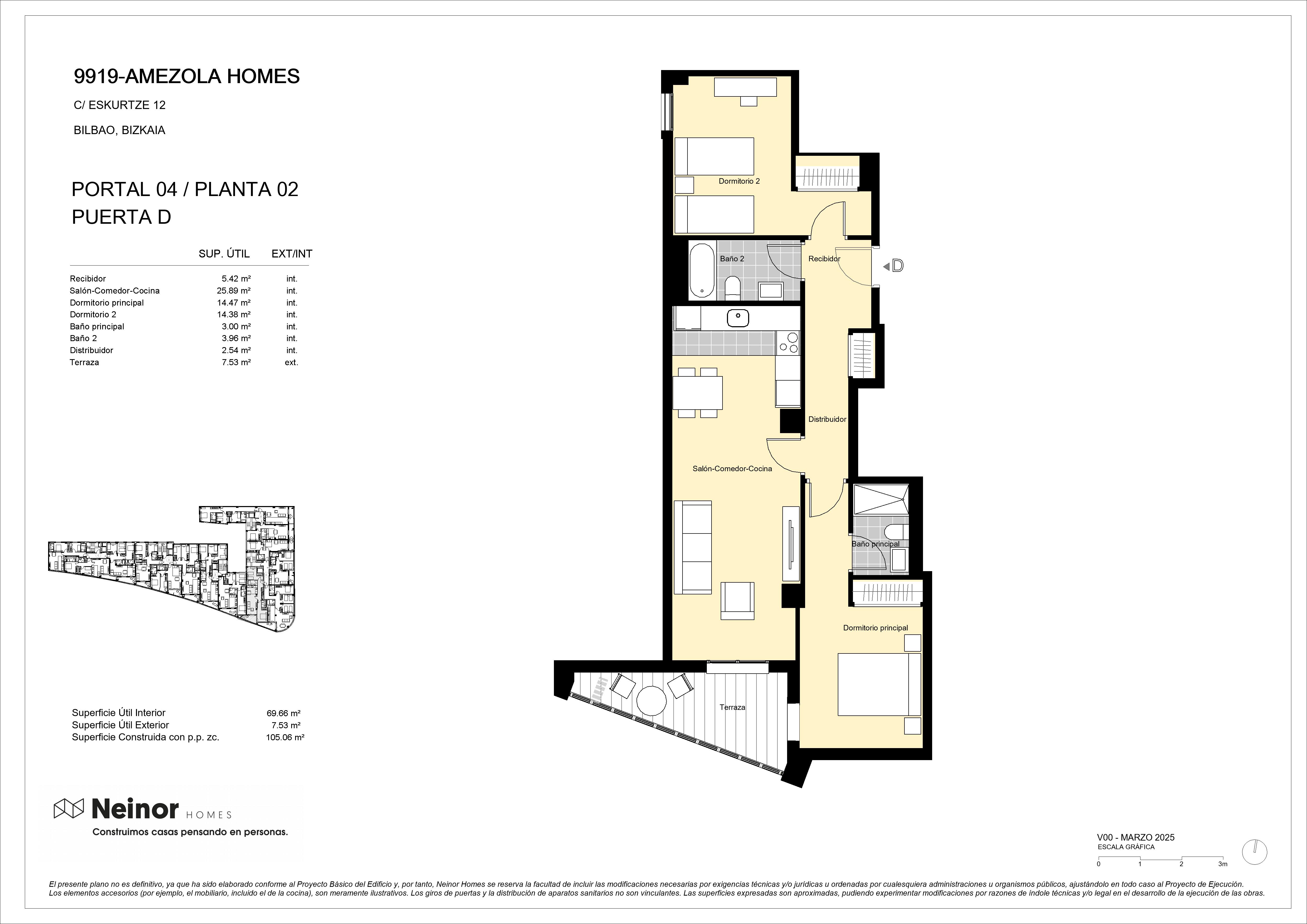 El conjunto residencial cuenta con 74 viviendas de 1, 2 y 3 dormitorios que permite satisfacer las demandas de nuestros residentes. Todas las viviendas han sido diseñadas optimizando la distribución, la luz y la orientación, para ofrecer viviendas modernas y funcionales. Amezola Homes cuenta con armarios empotrados en los dormitorios, baño en suite en la habitación principal, garaje y trastero.