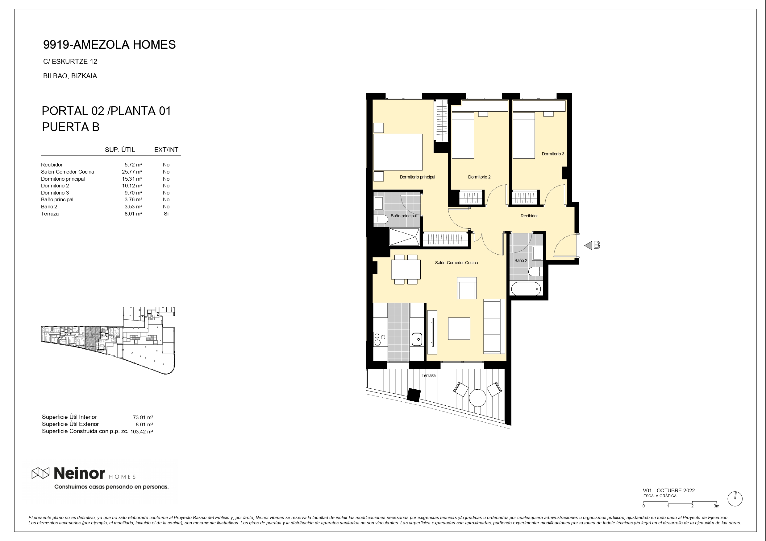 El conjunto residencial cuenta con 74 viviendas de 1, 2 y 3 dormitorios que permite satisfacer las demandas de nuestros residentes. Todas las viviendas han sido diseñadas optimizando la distribución, la luz y la orientación, para ofrecer viviendas modernas y funcionales. Amezola Homes cuenta con armarios empotrados en los dormitorios, baño en suite en la habitación principal, garaje y trastero.