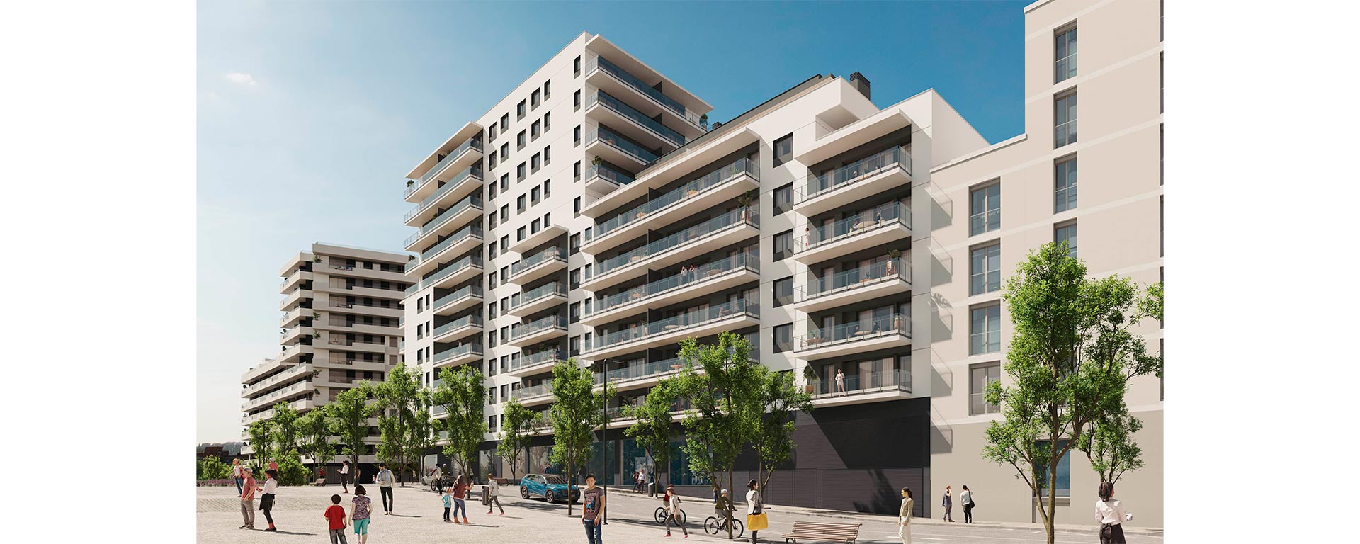 The development is located in a consolidated environment of great value, situated in the extension of La Rambla del Carme in Esplugues de Llobregat. It is a project in which all the homes have large terraces, with modern and warm façades, combining sustainable materials to save energy and offer wellbeing and comfort. The residential complex stands out for its communal areas that include: communal swimming pool, solarium, outdoor gym, green areas and children's play area. As if that were not enough, there will also be a room with a kitchen where community meetings or children's parties can be held, providing freshness and continuous contact with nature.