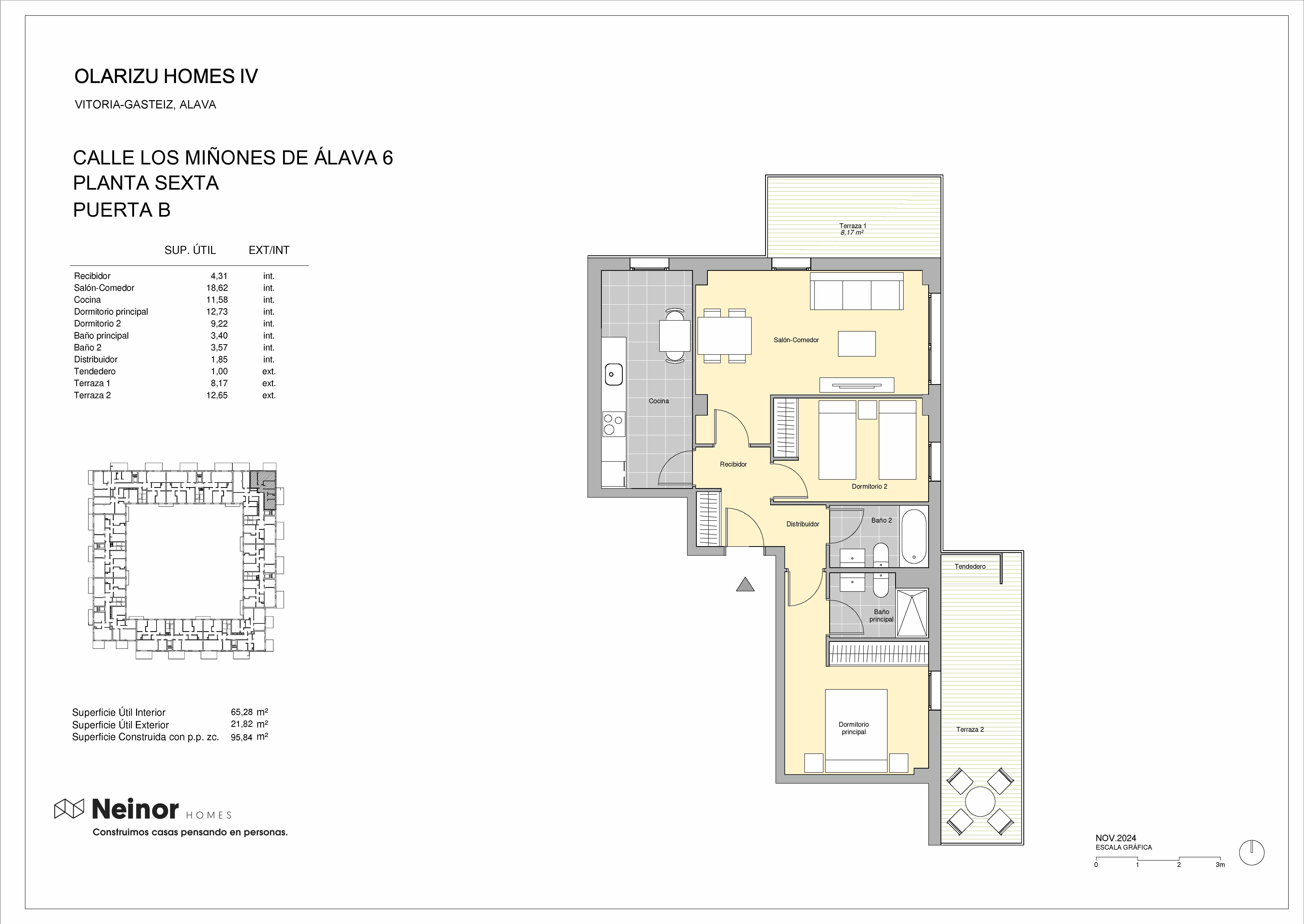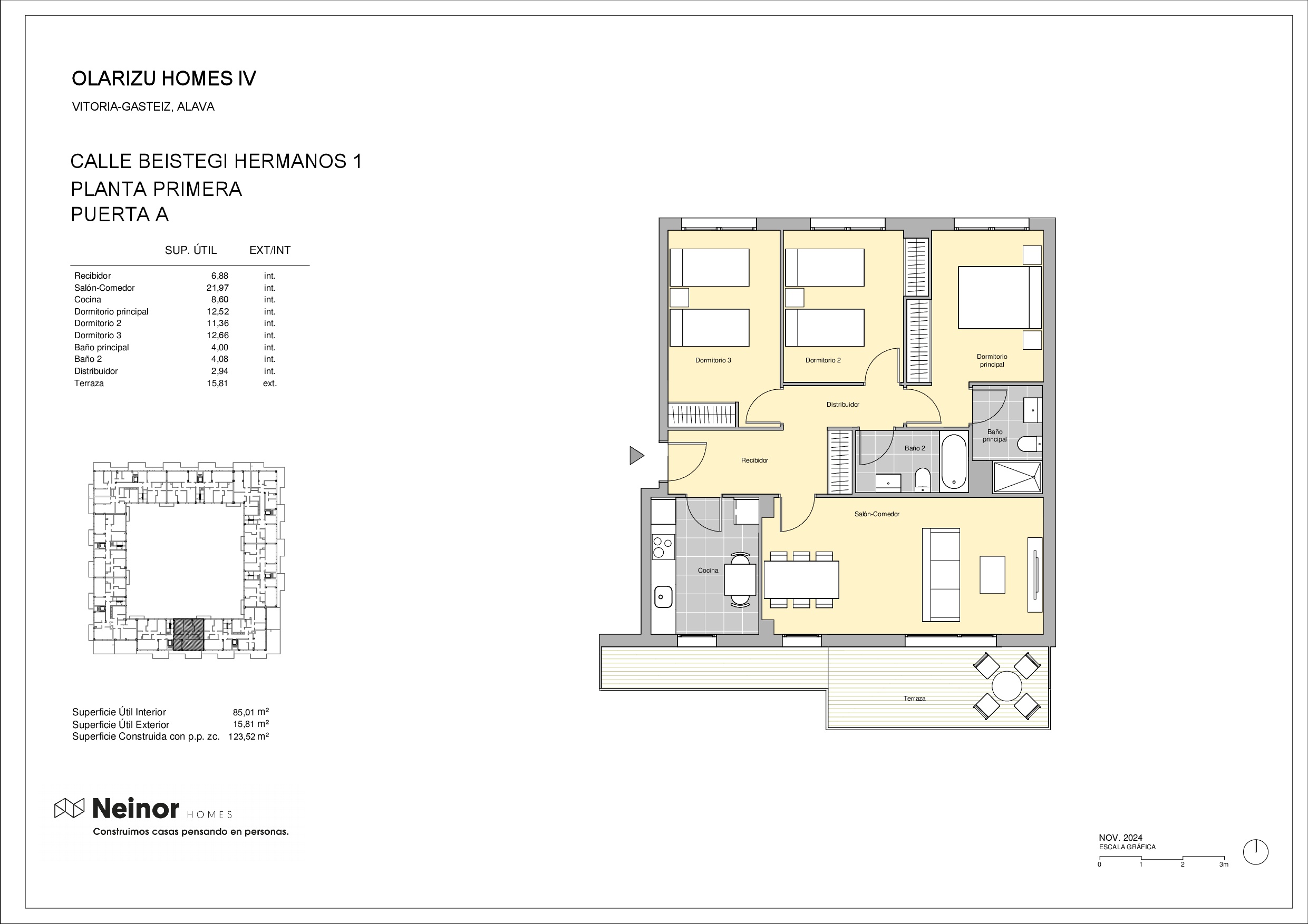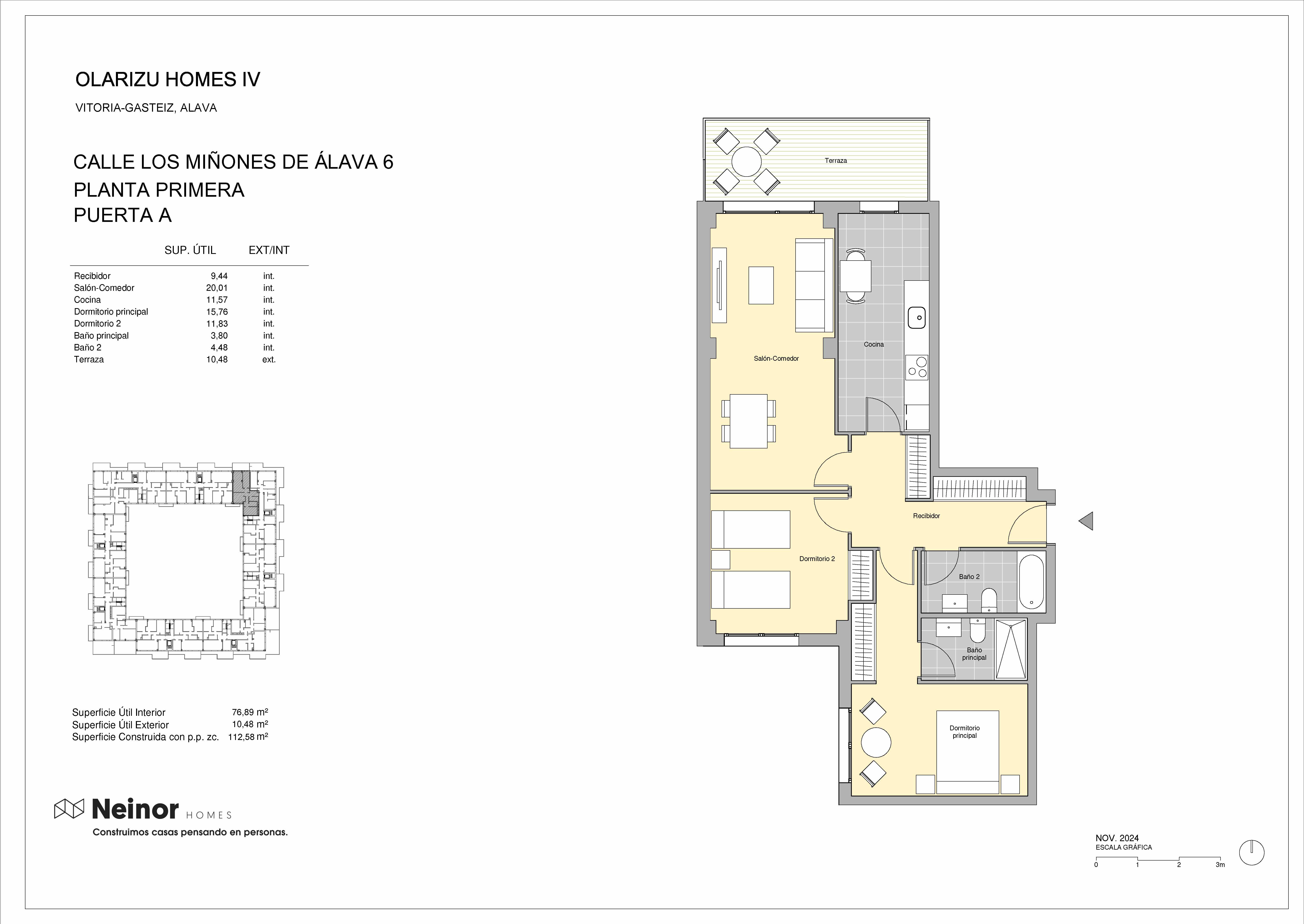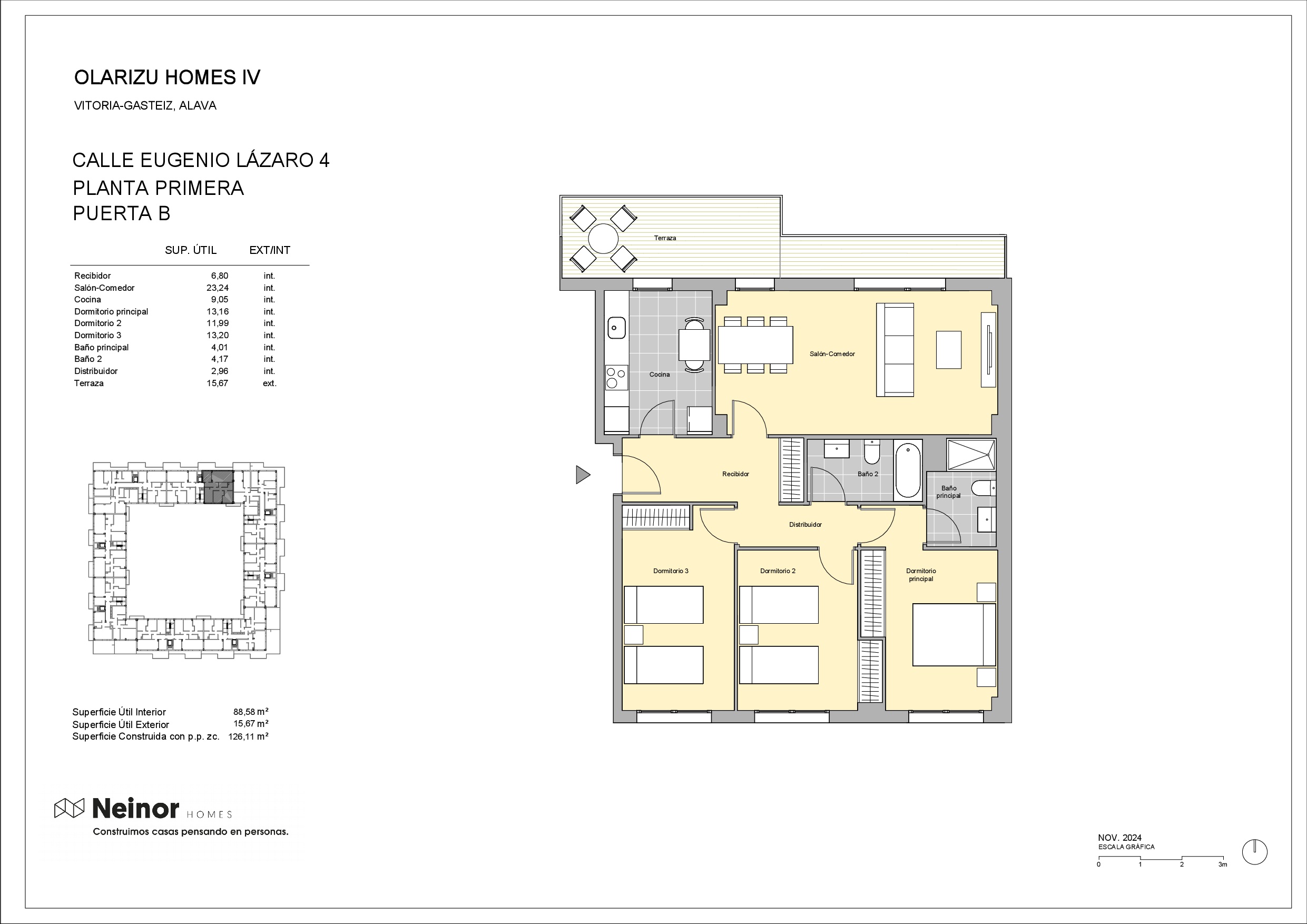 Olarizu Homes IV es un conjunto residencial que se desarrolla en ocho portales, formando una manzana completa. El edificio consta de 120 atractivas viviendas de 1, 2 y 3 dormitorios, todas con amplios ventanales y espaciosas terrazas que proporcionan una excelente luminosidad.