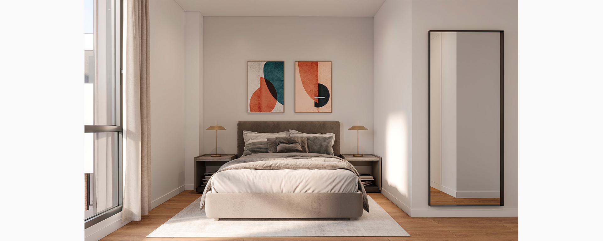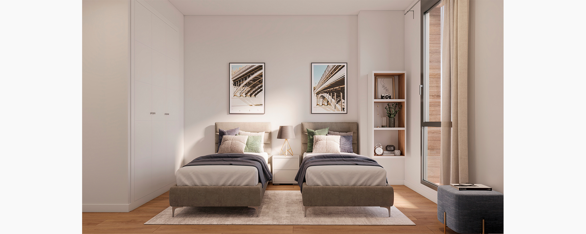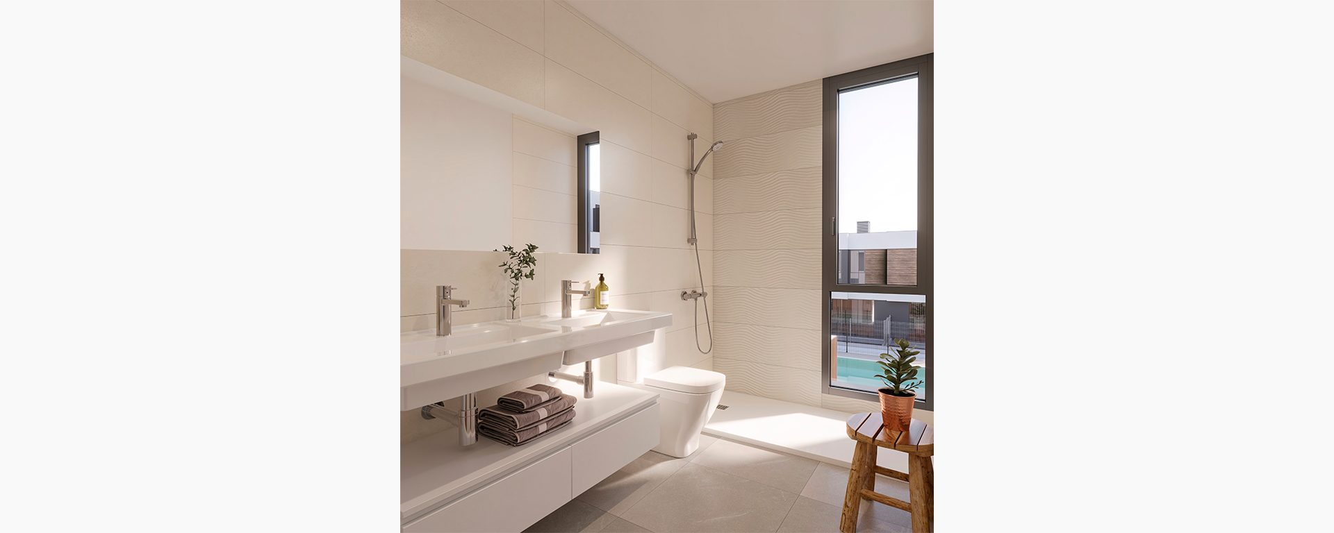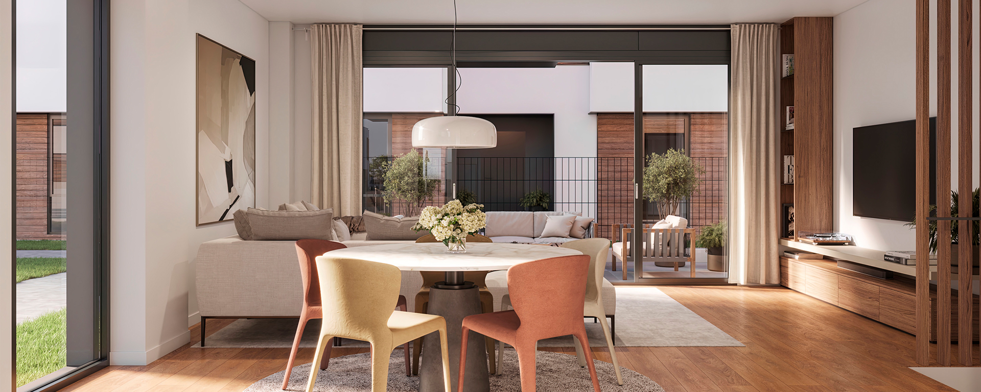 Gracias a los ventanales de gran formato, se consigue un óptimo aprovechamiento de la luz natural, dando como resultado viviendas muy luminosas y confortables. Todo ello unido a un sistema de AEROTERMIA y al aumento del aislamiento acústico, permite disfrutar de viviendas sostenibles con beneficios que van más allá de la eficiencia energética, ya que contribuyen a reducir considerablemente el gasto energético y benefician la salud y el bienestar de sus vecinos.
