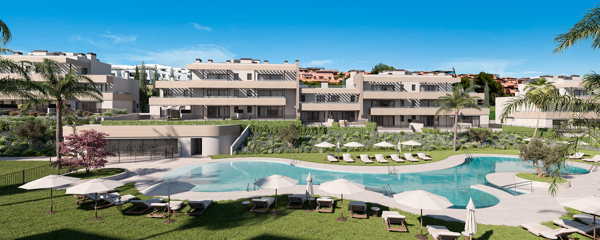 El conjunto residencial de Bliss Homes dispone de un total de 134 viviendas de 2, 3 y 4 dormitorios distribuidas en 9 bloques, cuyo diseño vanguardista y moderno se funde en el campo de golf colindante.