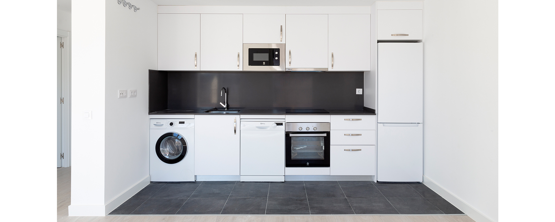 Comos Rental Homes ofrece viviendas con sistema de calefacción/refrigeración es con bomba frío/calor y cocinas totalmente equipadas con vitrocerámica, microondas, campana extractora, lavavajillas, frigorífico con congelador, vitrocerámica y lavadora.