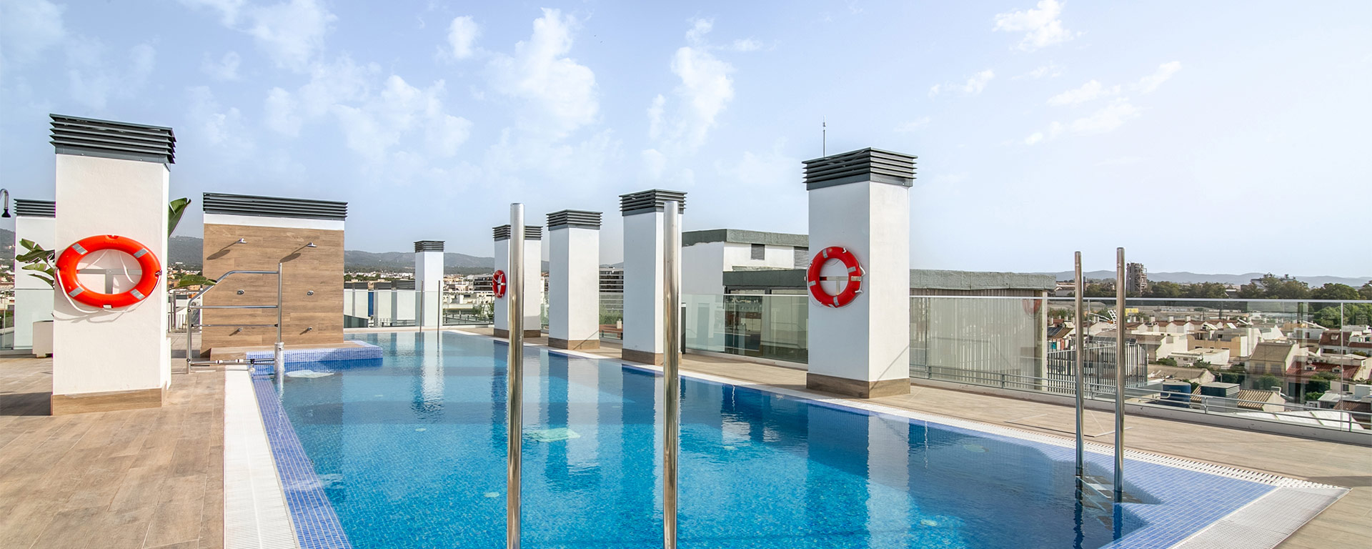 Almogávar Homes se completa con una piscina panorámica y zona de solárium en la cubierta del edificio para disfrutar al máximo del buen tiempo y combatir los días más calurosos del año en la ciudad.