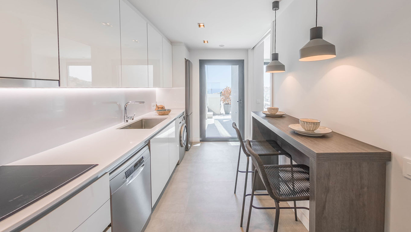 Entre los muchos detalles de calidad de Limonar Homes, destacan las cocinas que incorporarán amueblamiento completo con muebles de máxima calidad, encimera de cuarzo compacto o piedra natural y dotación completa de electrodomésticos: lavadora, lavavajillas, frigorífico, placa de inducción, campana, horno, microondas e iluminación LED integrada entre muebles.
