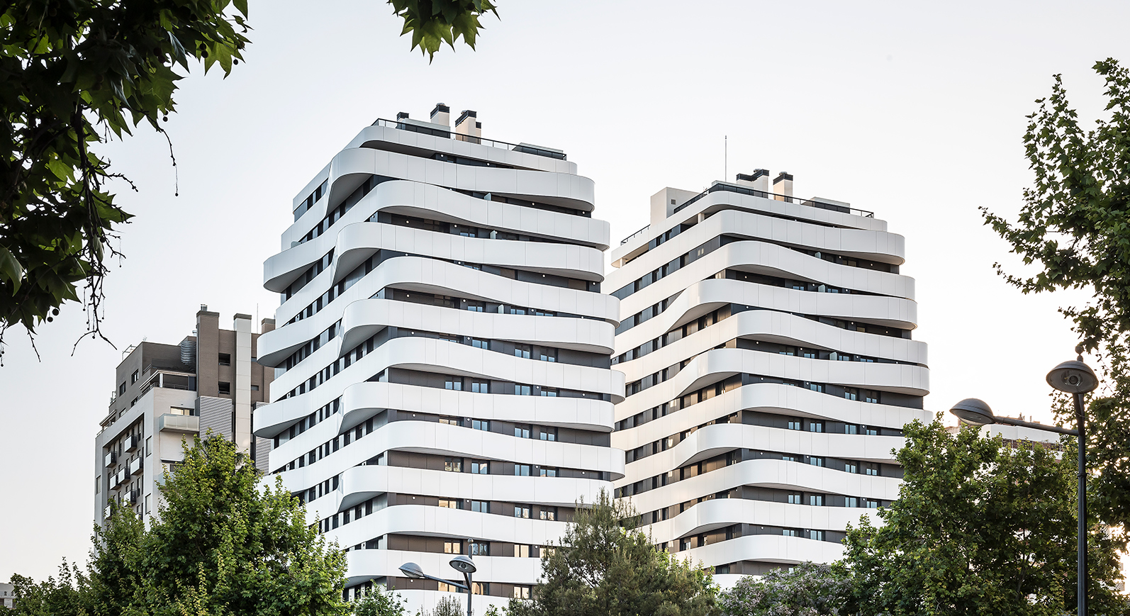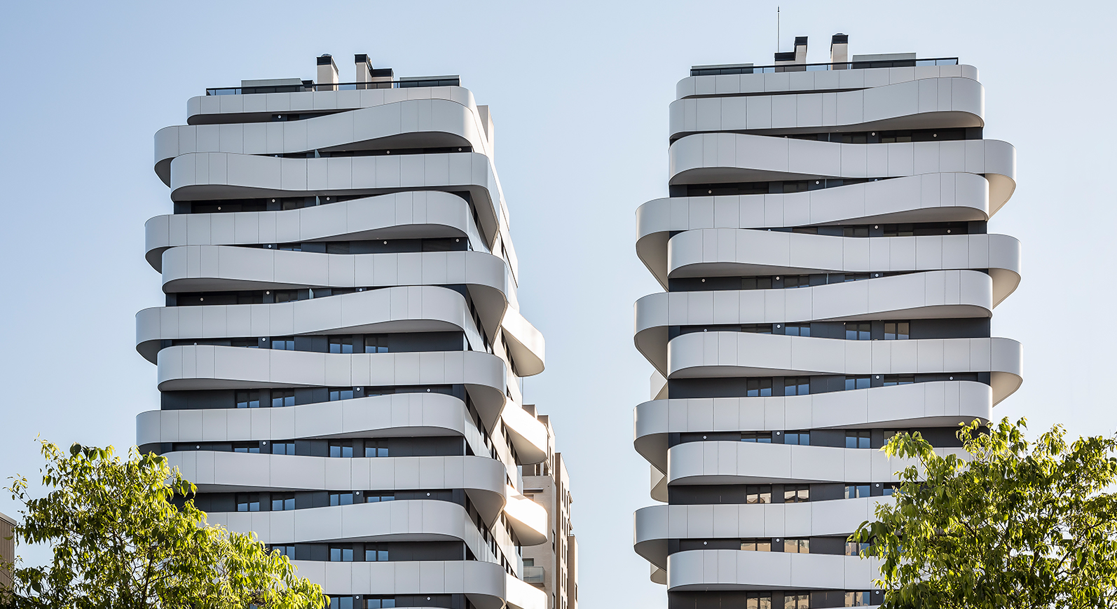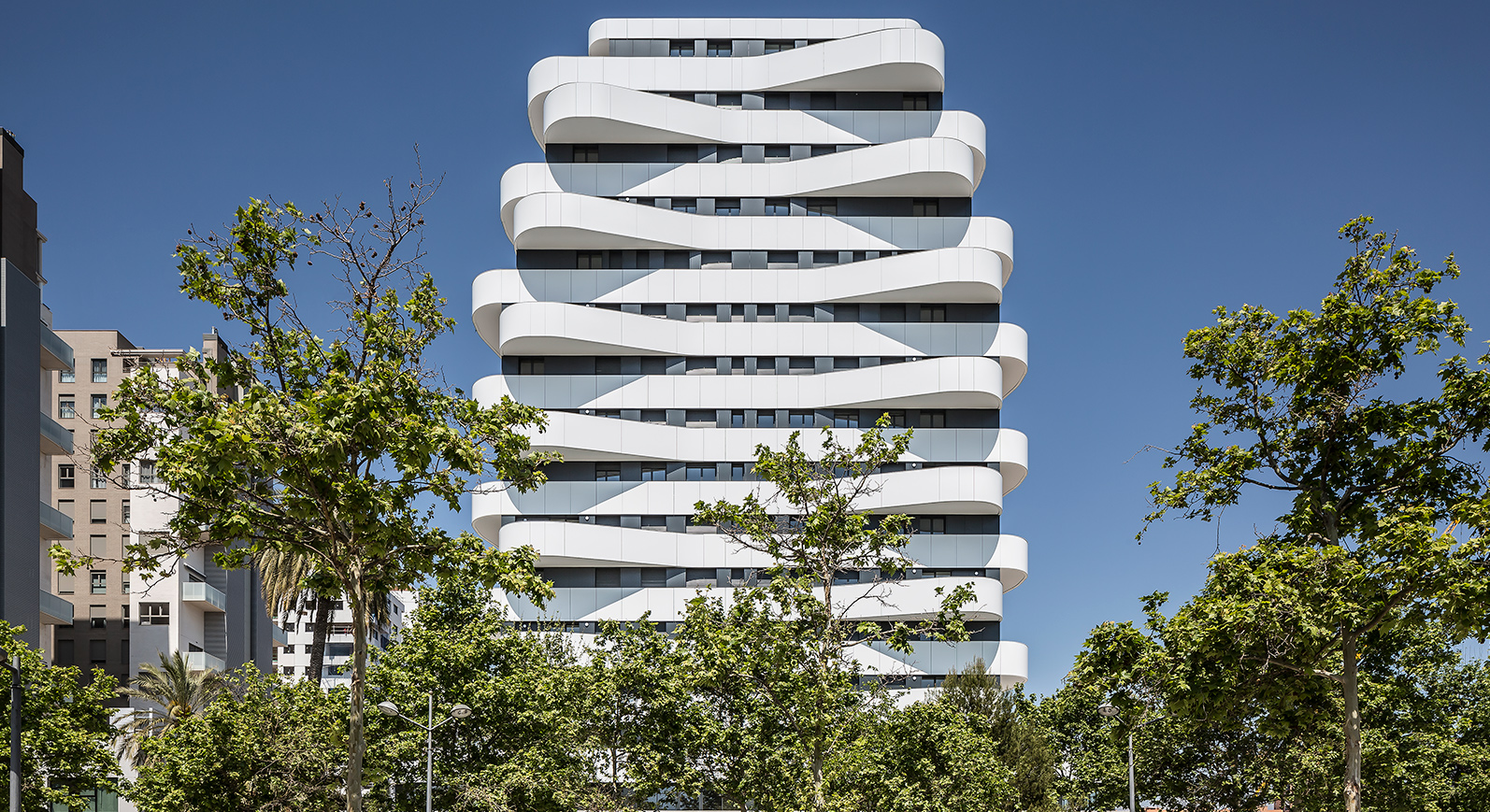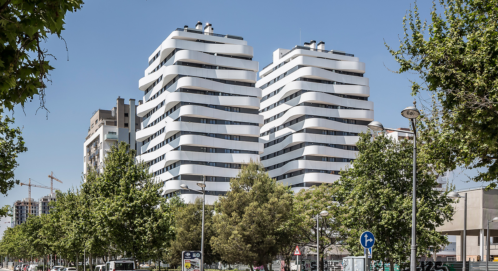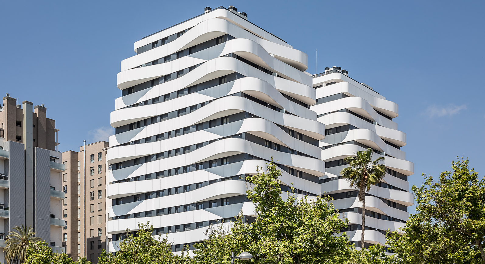 Dos edificios de 15 plantas de altura y singulares terrazas componen este característico complejo de pisos en venta en Quatre Carreres.