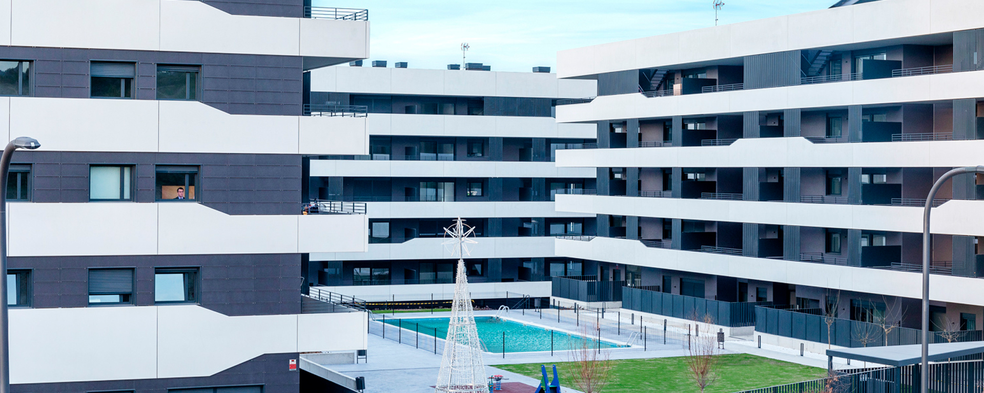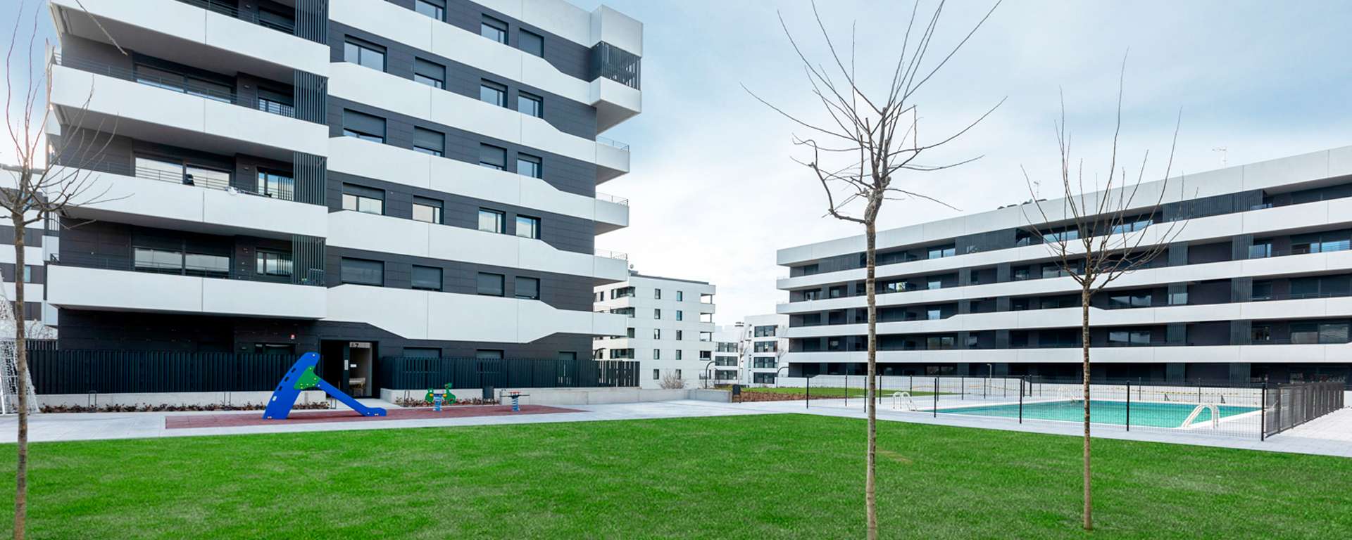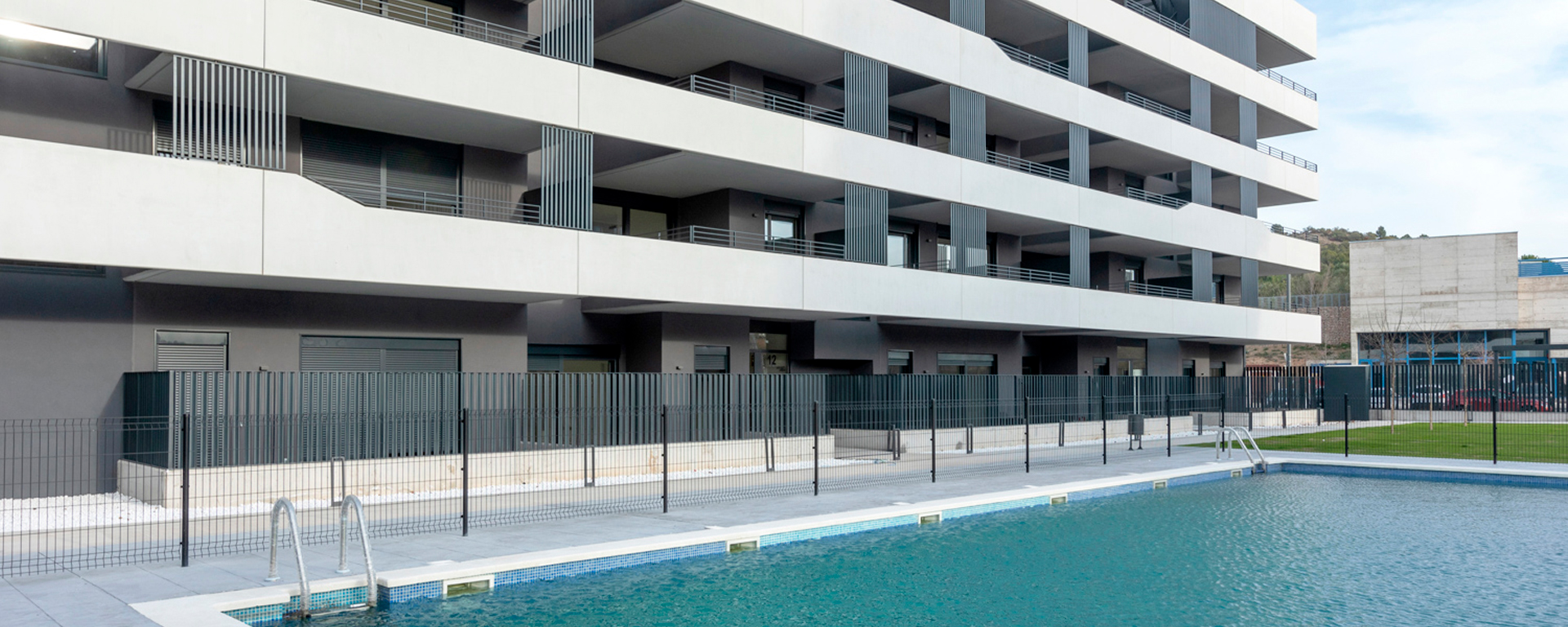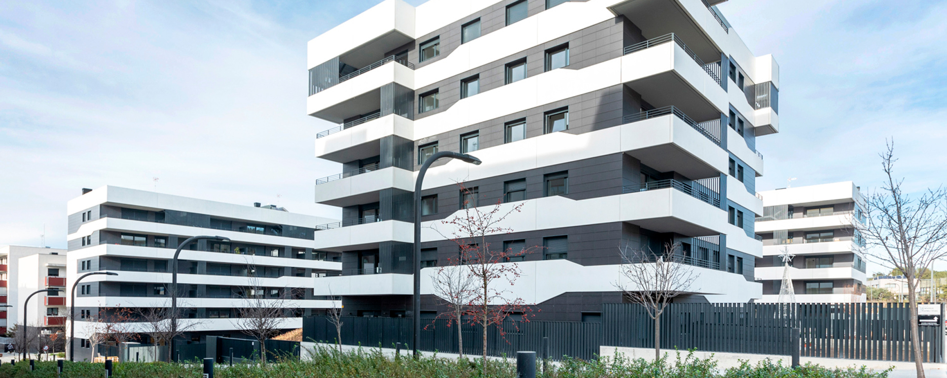 Esta promoción residencial se compone de 3 edificios que destacan por la modernidad y elegancia de su arquitectura exterior. Uno de ellos consta de planta baja más 4 alturas y otros dos edificios de planta baja más 5 alturas. También dispone de 152 plazas de aparcamiento y 102 trasteros. Plaza de aparcamiento y trastero no incluido.
