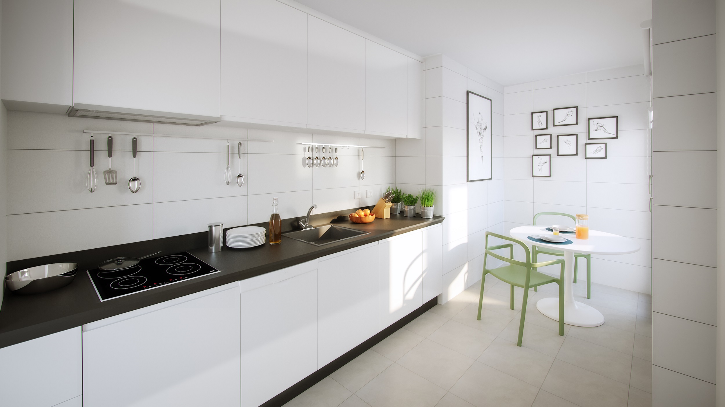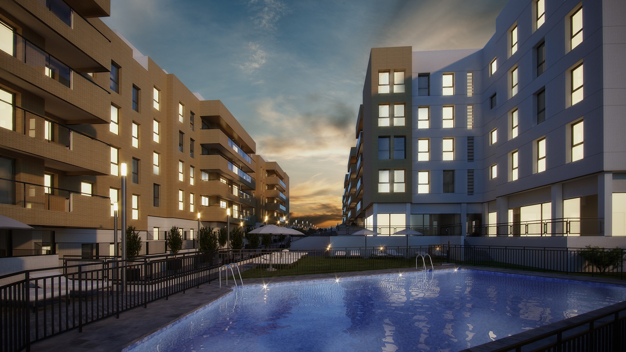 Los pisos de nueva construcción de Aviva Homes disponen de garaje y trastero incluidos en el precio. Esta urbanización de obra nueva cuenta con amplias zonas comunes, piscina y área de juegos infantiles.