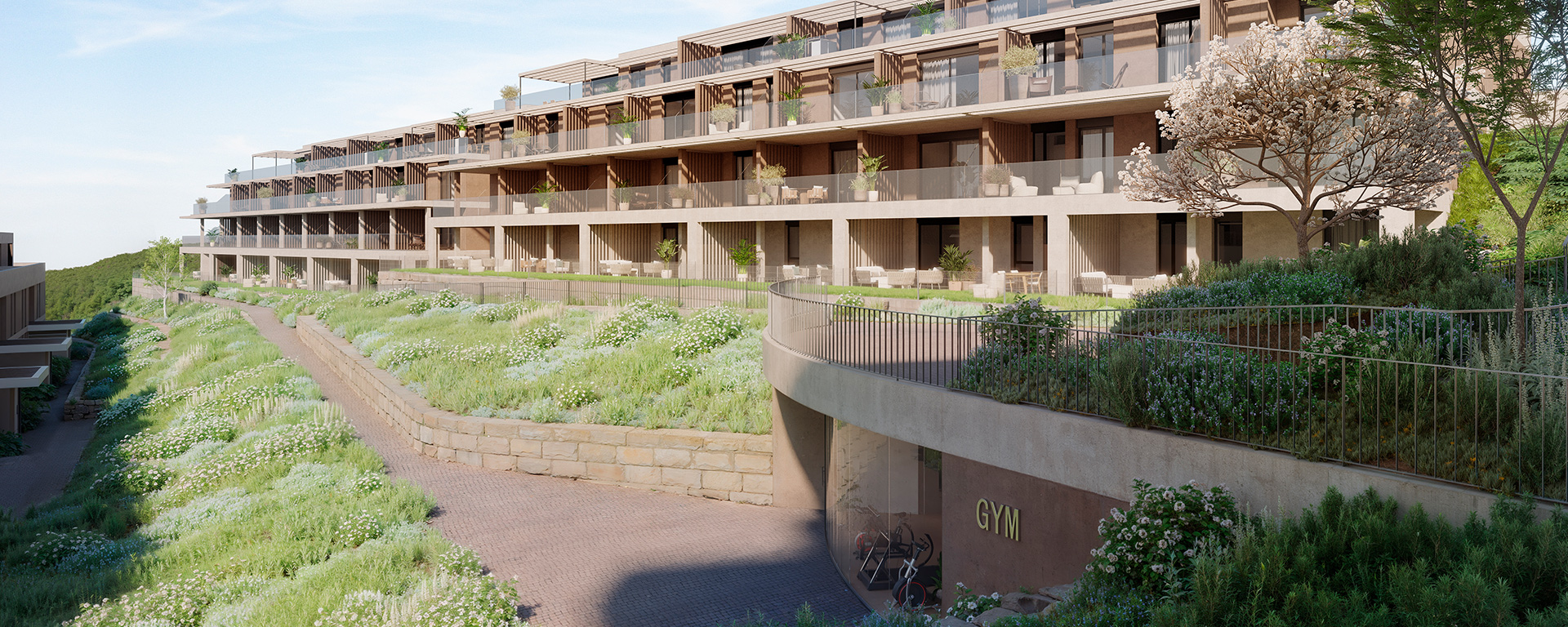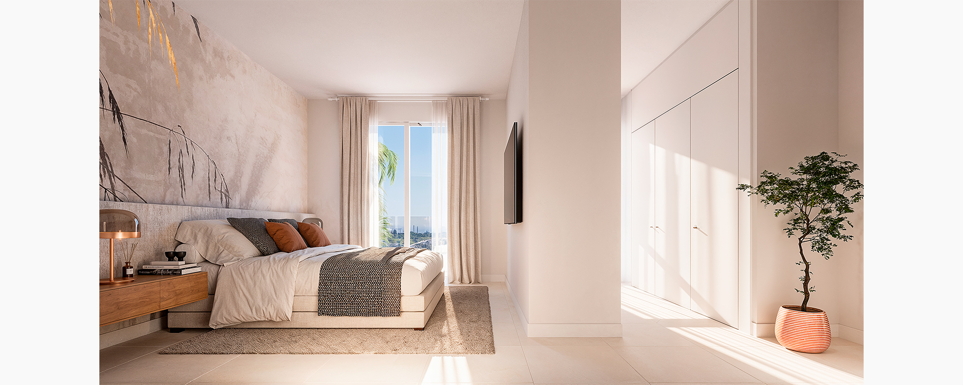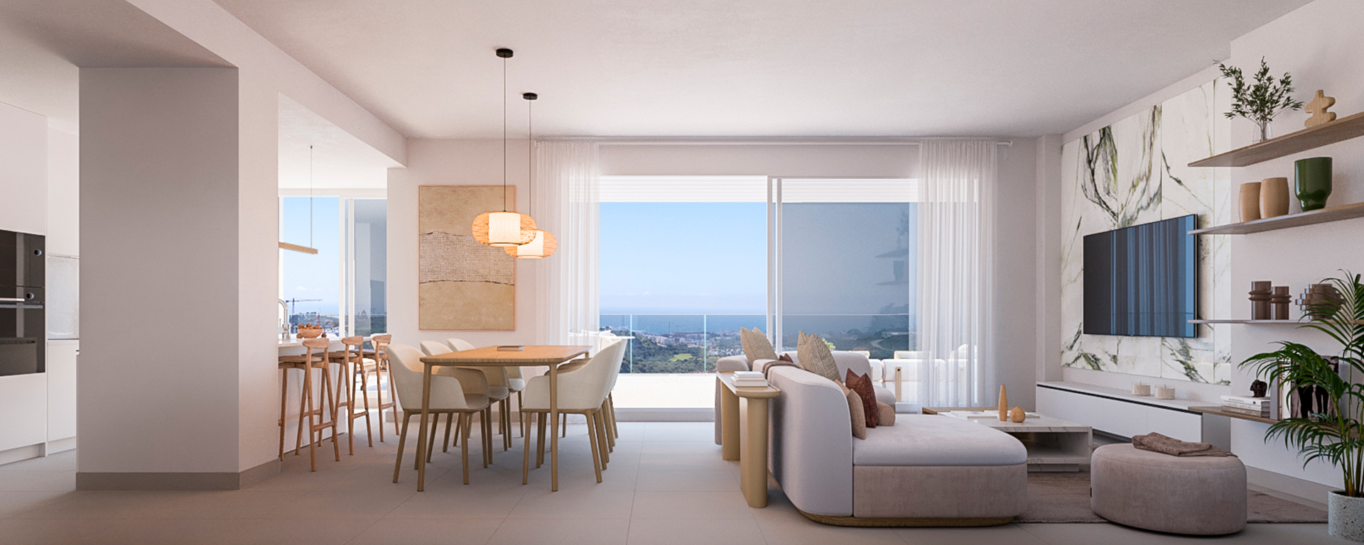 Etherna Homes II es un exclusivo conjunto residencial compuesto por 144 viviendas de 1, 2 y 3 dormitorios, distribuidas en seis edificios de baja altura. Su diseño vanguardista y moderno se integra perfectamente con el entorno natural, ofreciendo a sus residentes unas vistas espectaculares a la Bahía de Estepona y al campo de golf de Valle Romano.