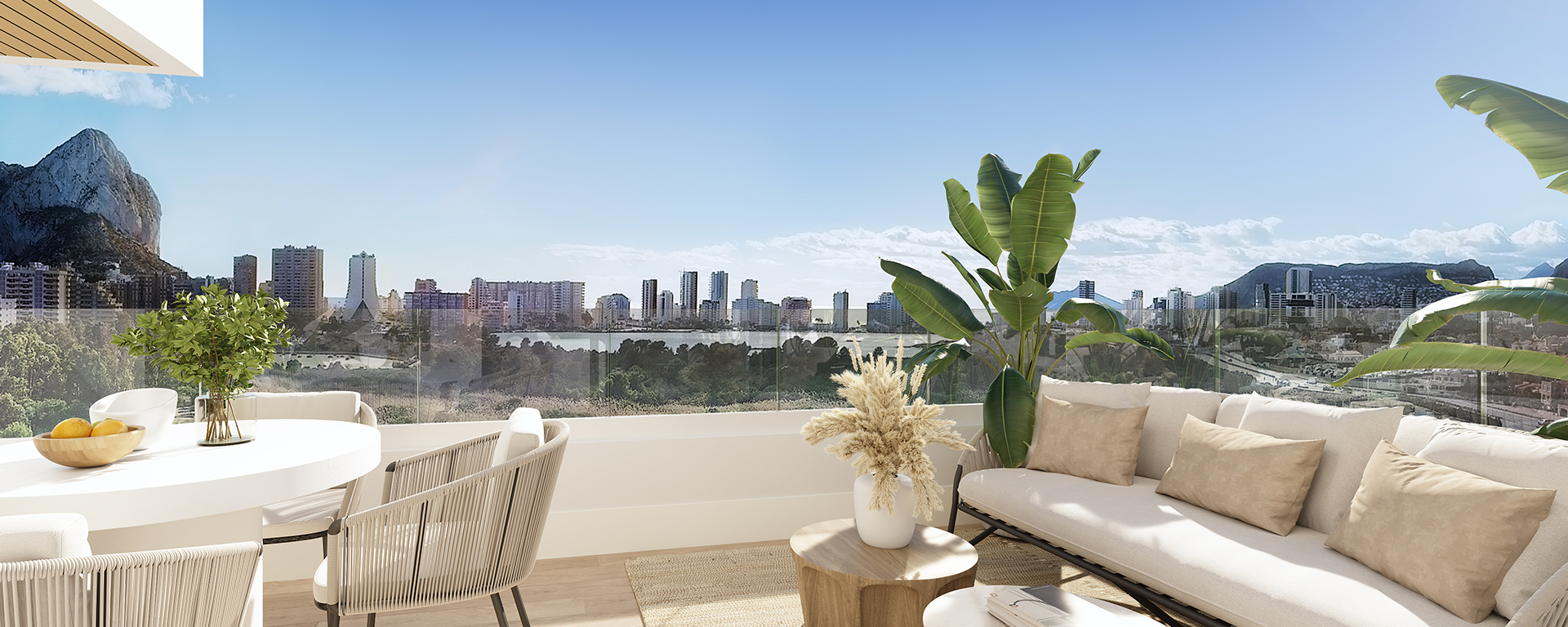 Con una arquitectura singular, dos edificios de 10 plantas de altura albergarán pisos de obra nueva de 2 y 3 dormitorios, en cuyas terrazas podrá deleitarse del buen clima y las vistas de Calpe.