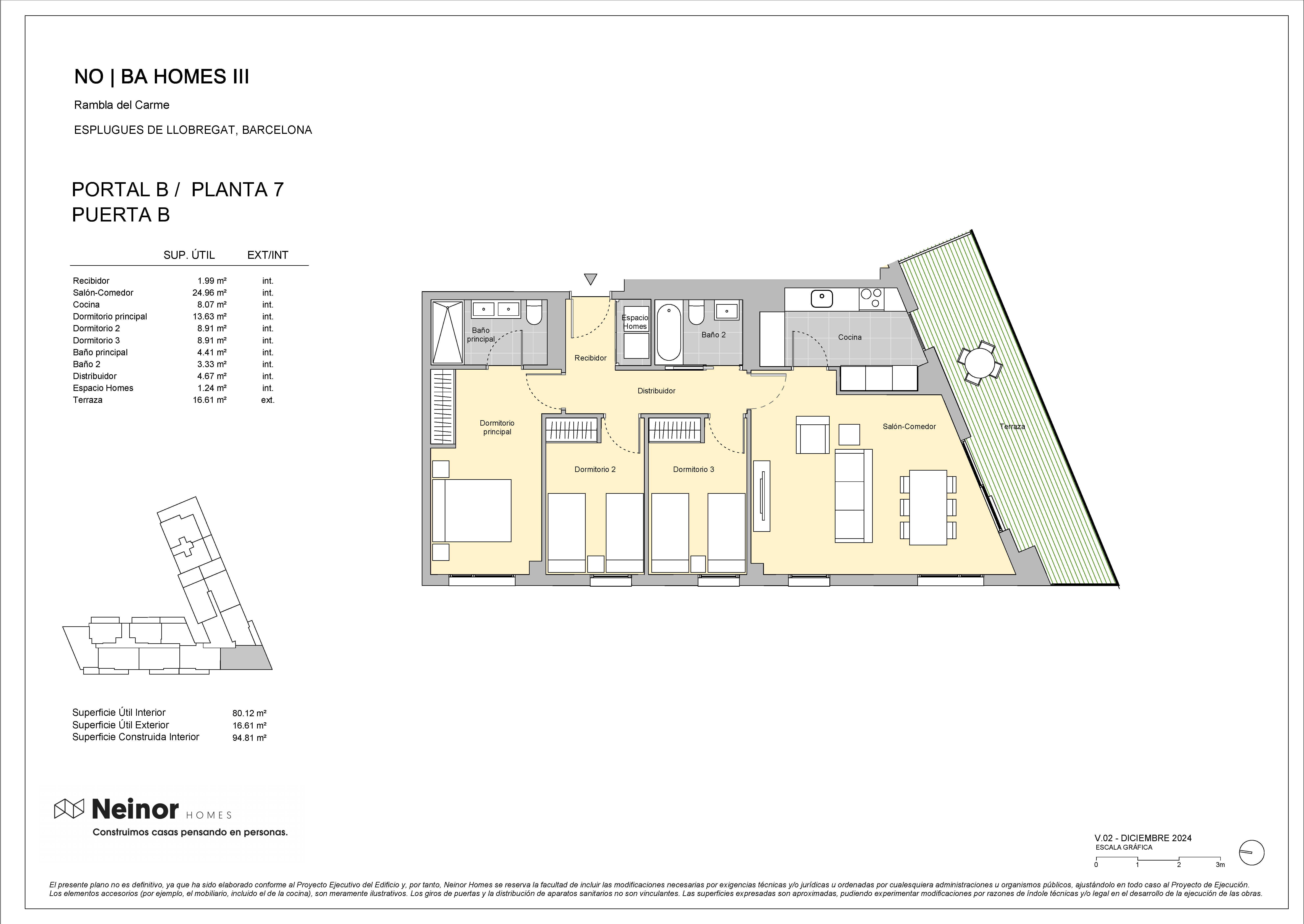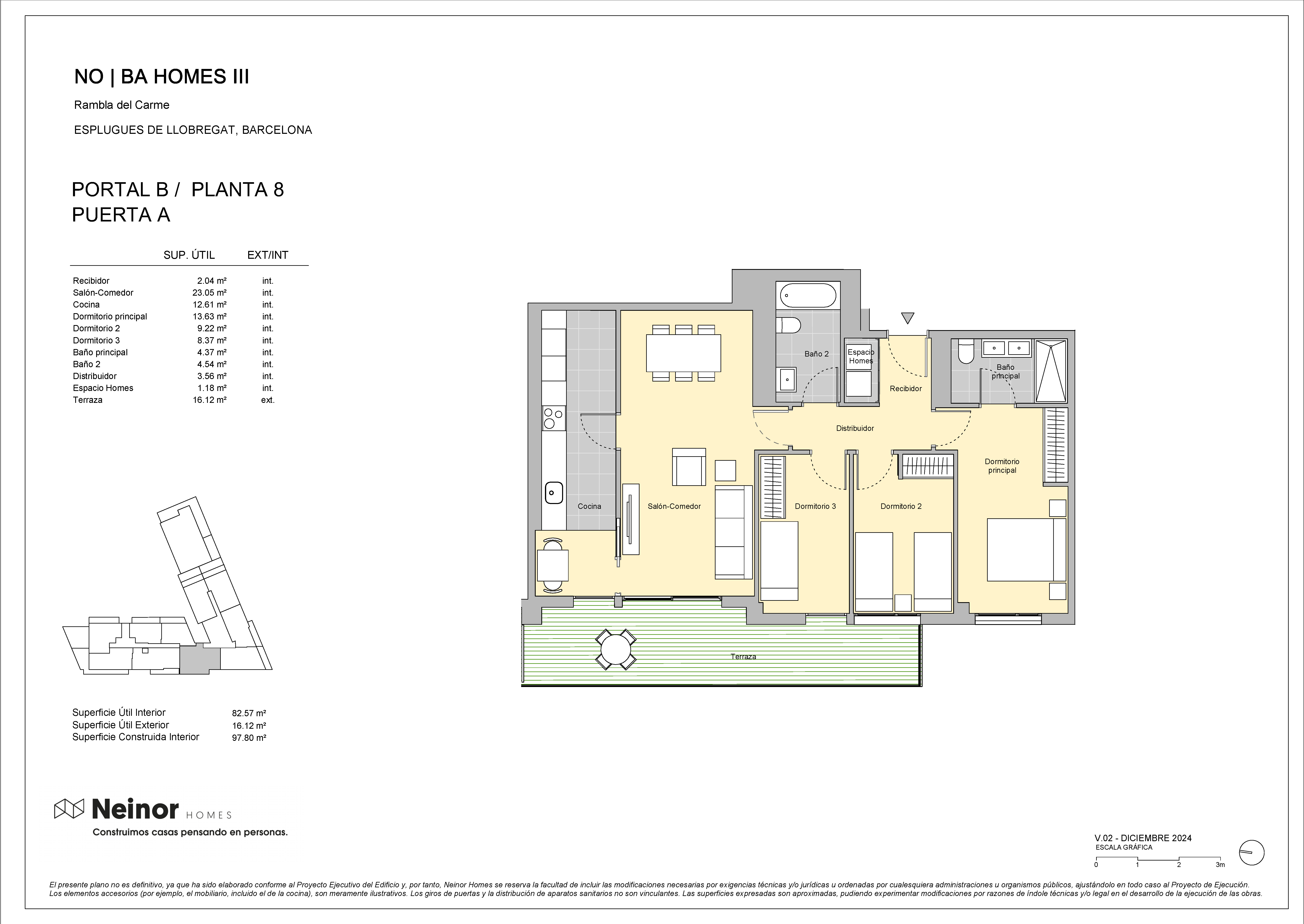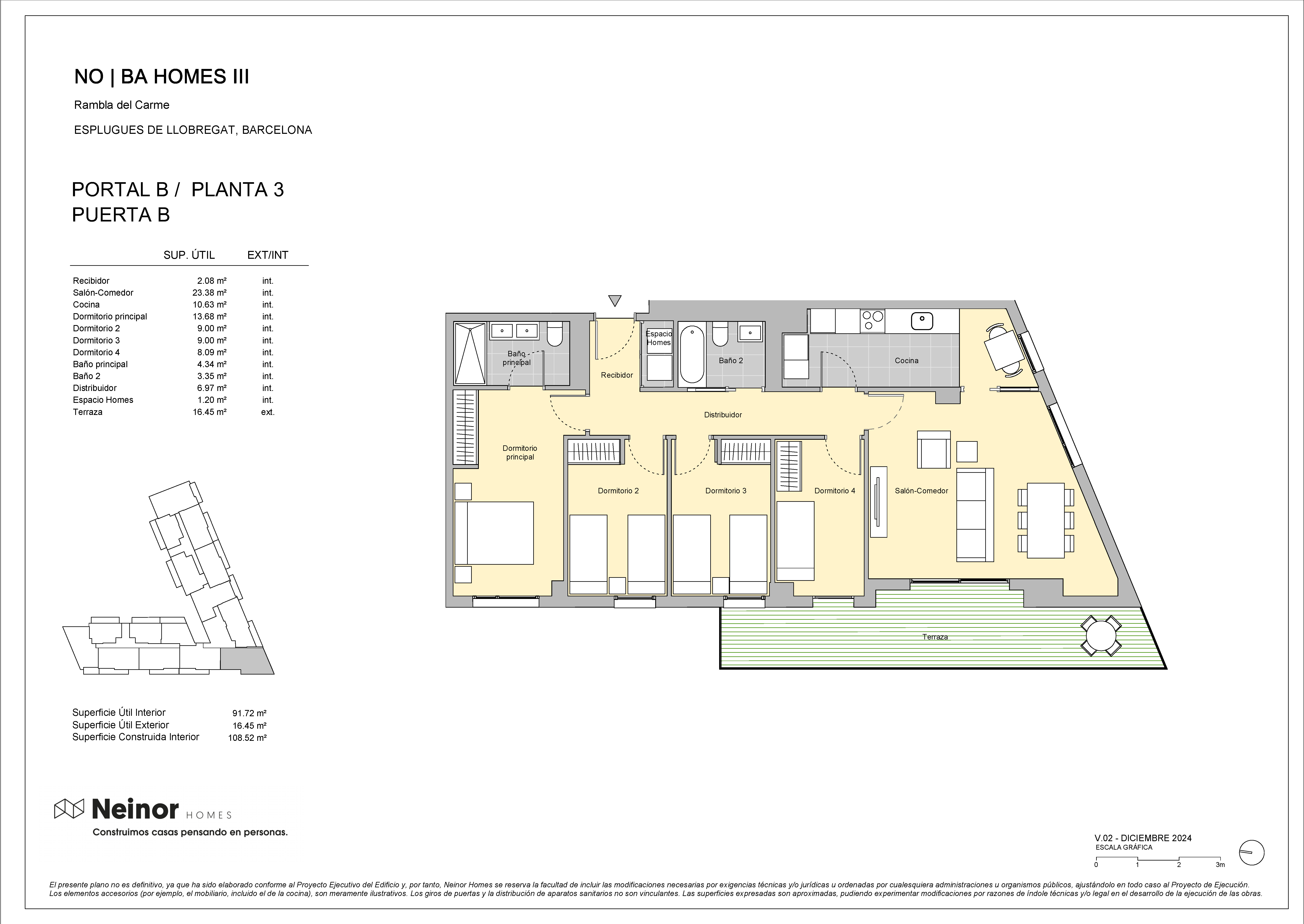 NO|BA Homes III es un conjunto residencial dispuesta de planta baja más 7 alturas, planta baja más 9 alturas y planta baja más 11 alturas, compuesta por 126 viviendas de 2,3 y 4 dormitorios distribuidas entre 3 escaleras.