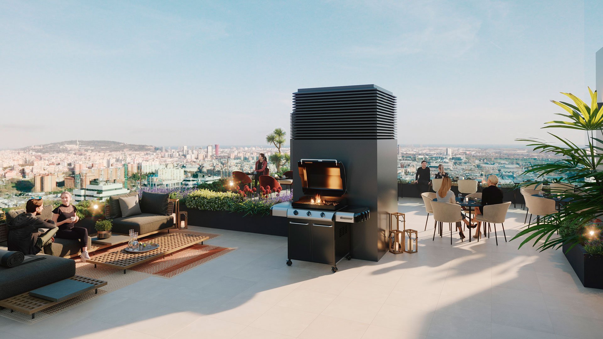 Las 90 viviendas cuentan con 2, 3 o 4 dormitorios, distribuidas en planta baja más 4 alturas y planta baja más 14 alturas, todas con acabados de alta calidad. Este conjunto residencial incluye una amplia zona Chill Out en la azotea de la planta 15, con magníficas vistas, un gimnasio exterior en la planta 5 para ejercitarse al aire libre y un taller de bicicletas en el garaje.