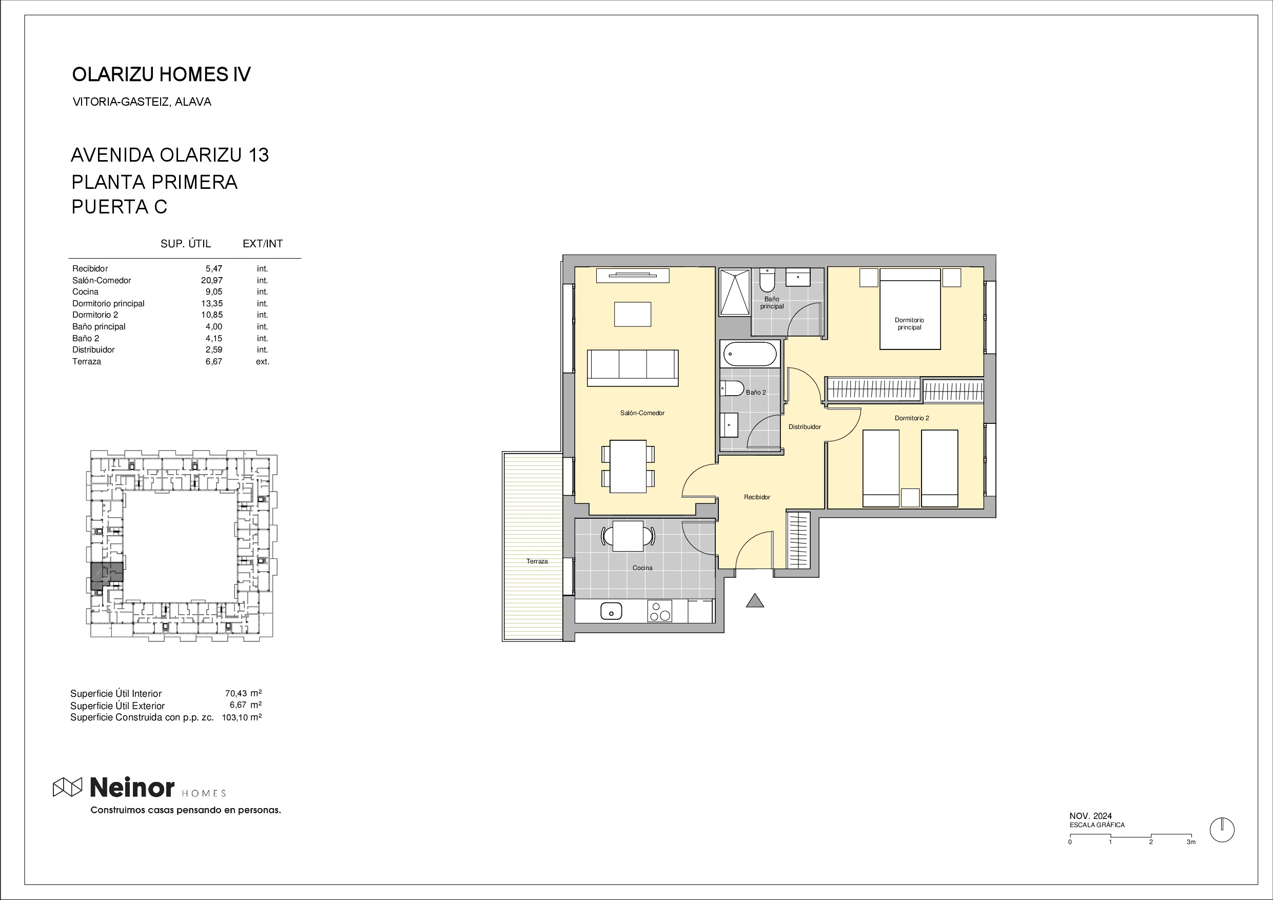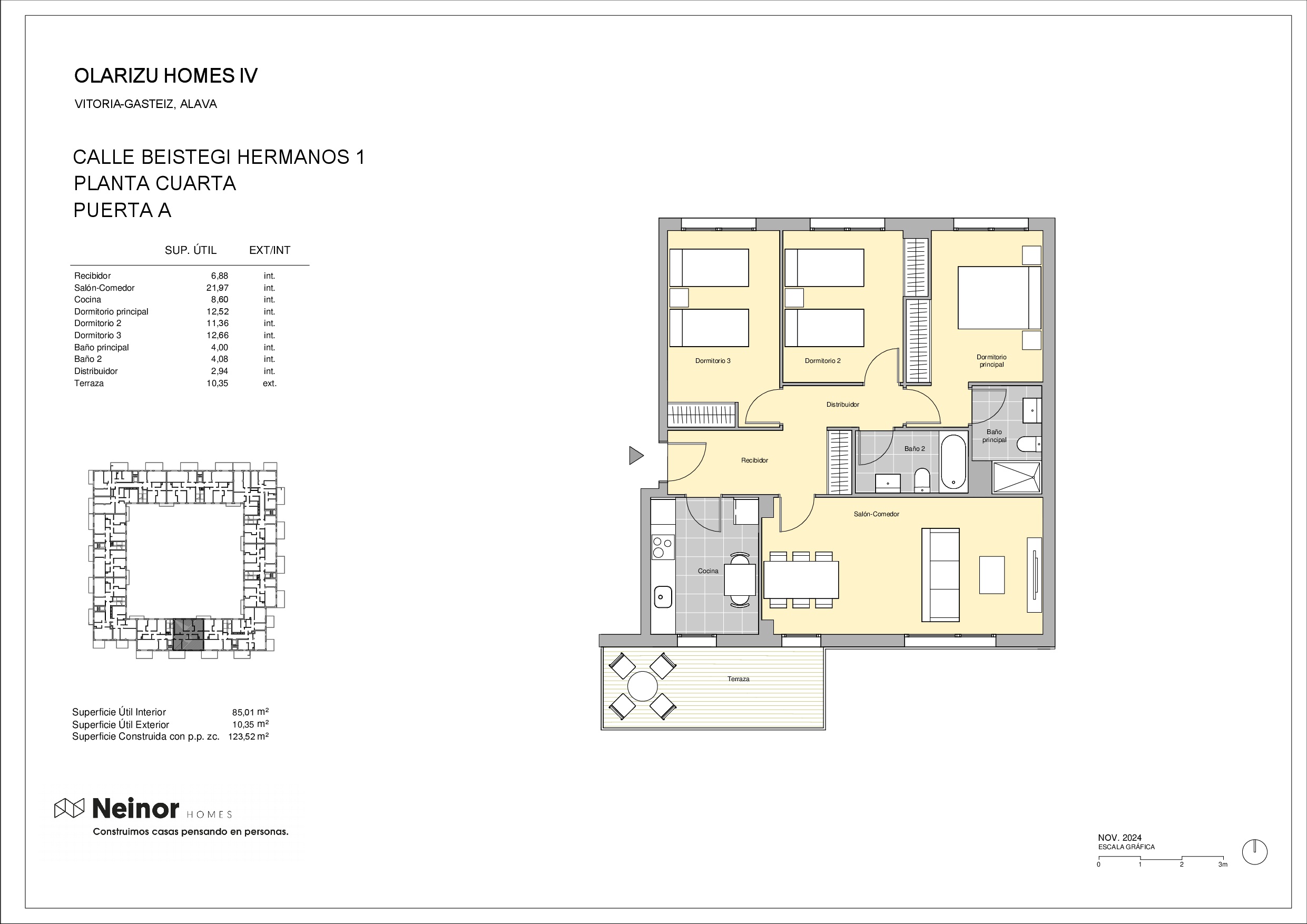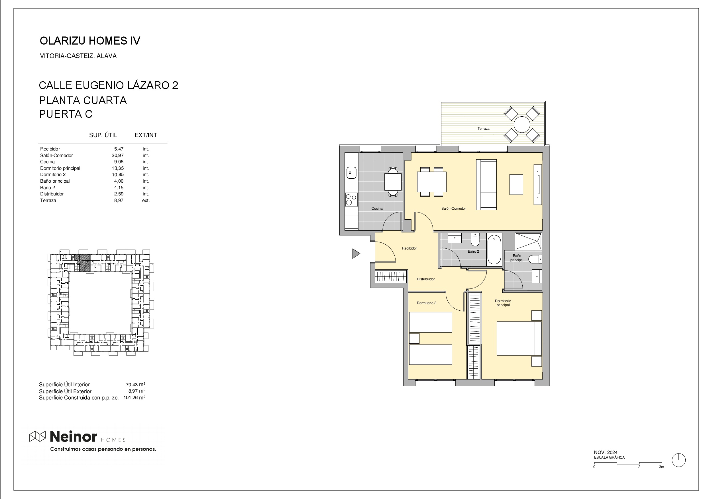 Olarizu Homes IV es un conjunto residencial que se desarrolla en ocho portales, formando una manzana completa. El edificio consta de 120 atractivas viviendas de 1, 2 y 3 dormitorios, todas con amplios ventanales y espaciosas terrazas que proporcionan una excelente luminosidad.