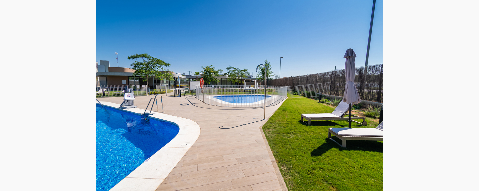 SEVILLA HOMES CLUB, el primer Living Club de Sevilla. Un complejo con espectaculares zonas comunes, varias piscinas, una de ellas de nado, gimnasio, cafetería, zona de juegos infantiles, guardería, zonas deportivas y, todo ello, a escasos 5 minutos de la Avenida de la Palmera y de uso único y exclusivo para los propietarios de Sevilla Homes Village I, II, III y Sevilla Homes Design.