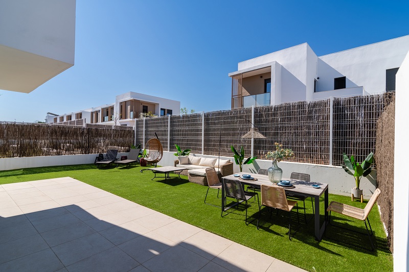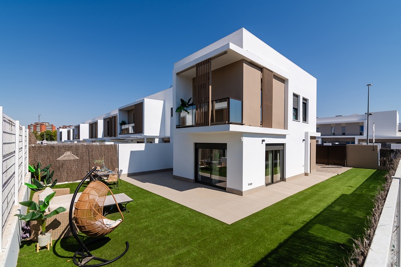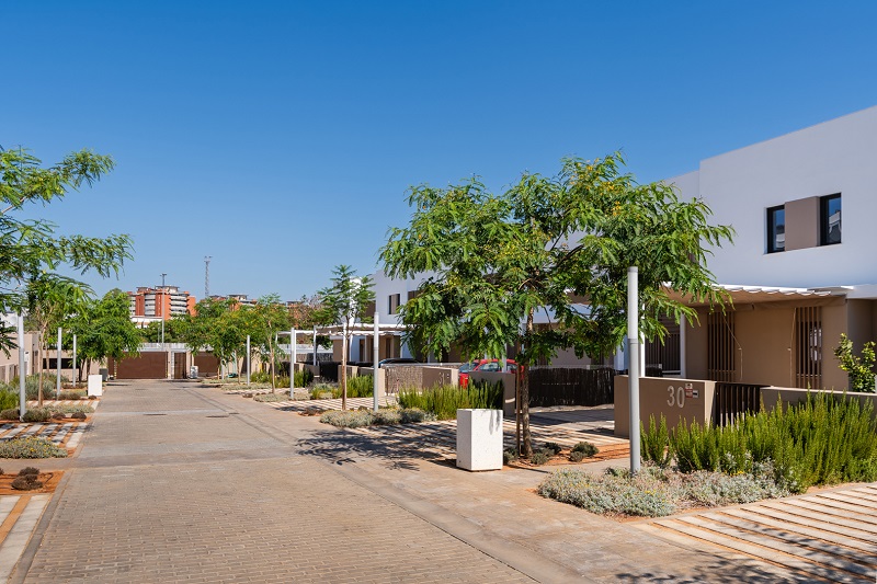 Sevilla Homes Village II, conjunto residencial de 68 viviendas adosadas y pareadas de 3 y 4 dormitorios con 2 plazas de garaje en superficie, jardín delantero y trasero y bodega diáfana con luz y ventilación en sótano.