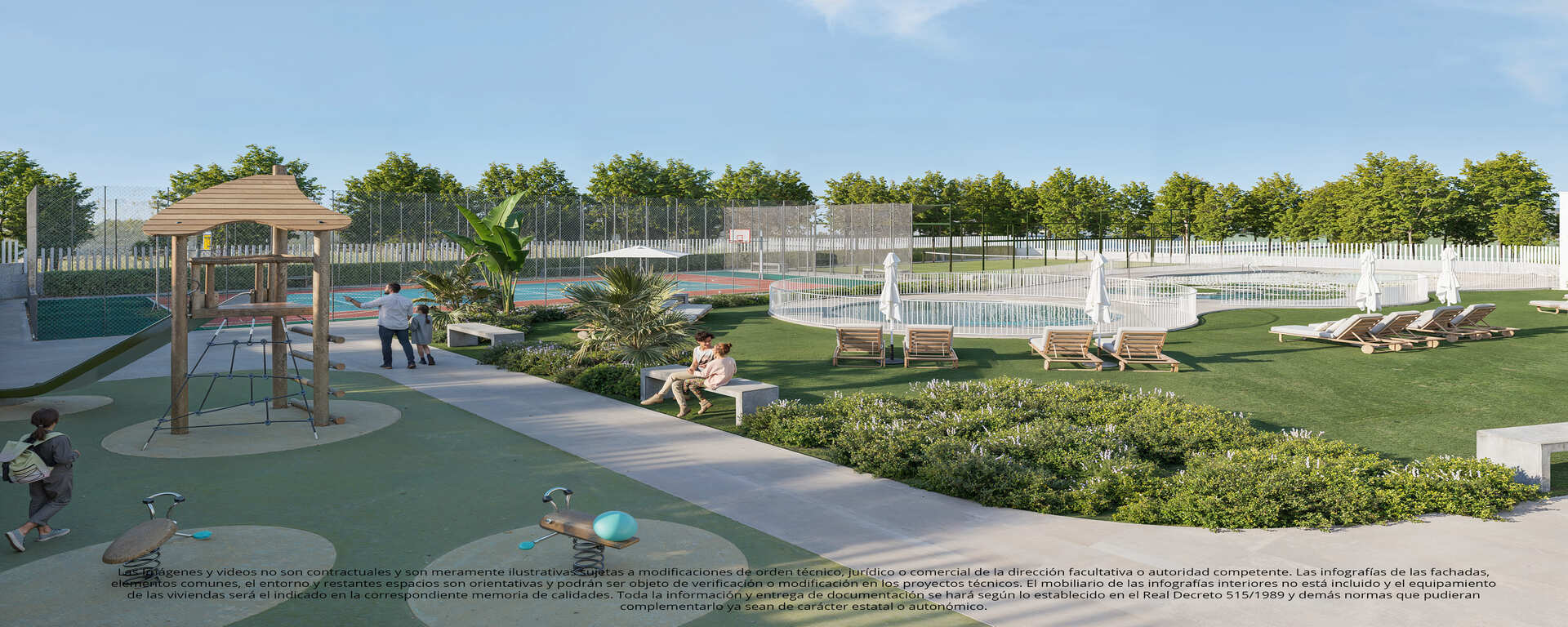 Este entorno está rodeado de bulevares arbolados y áreas infantiles de juegos, creando un ambiente perfecto para disfrutar de la tranquilidad y la naturaleza sin salir de tu hogar.