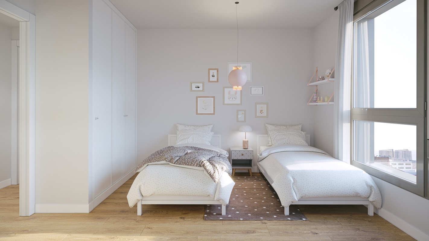 Última vivienda de 2 dormitorios disponible, situada en planta primera, con una distribución equilibrada y muy funcional, que diferencia claramente la zona de día de la zona de noche, aportando confort y privacidad.